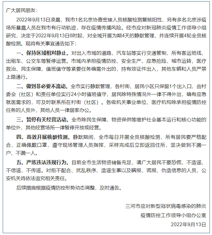 河北省三河市應(yīng)對新型冠狀病毒感染的肺炎疫情防控工作領(lǐng)導(dǎo)小組辦公室9月13日發(fā)布通告,決定于2022年9月13日6時(shí)起,對全域開展為期4天的靜默管理,并連續(xù)開展4輪全員核酸檢測。通告全文如下: