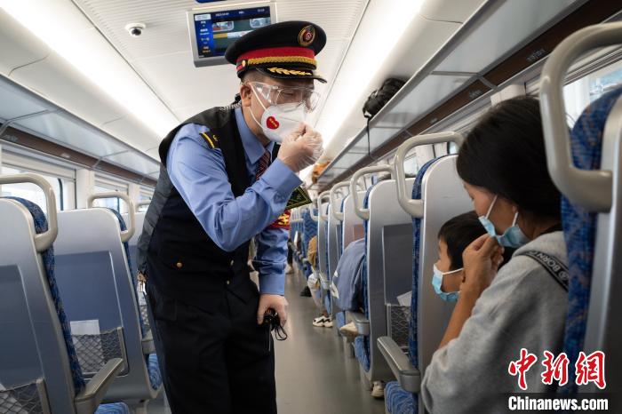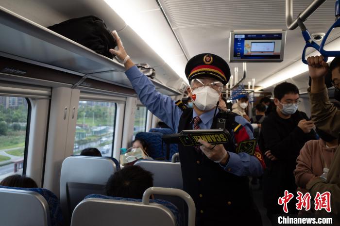 “請保管好自身財物,看管好小孩,照顧好老人,上下車注意腳下安全。”數(shù)百名乘客陸續(xù)上車后,鐘靜開始在車廂里巡視。疫情防控期間,他要提醒大家戴好口罩。遇到行李架上行李擺放不規(guī)范,他要動手整理。同時,他還負責(zé)整列4節(jié)車廂的查票、補票工作。