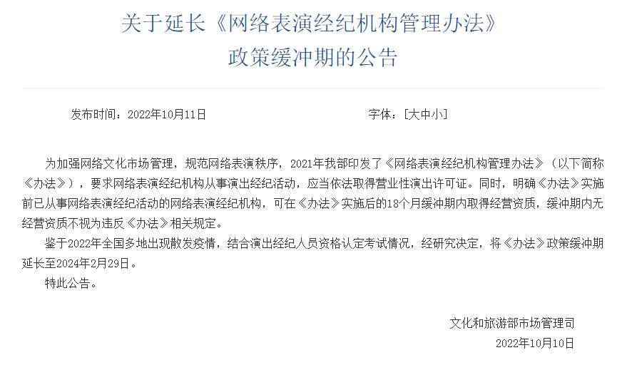 文旅部:延長(zhǎng)《網(wǎng)絡(luò)表演經(jīng)紀(jì)機(jī)構(gòu)管理辦法》政策緩沖期