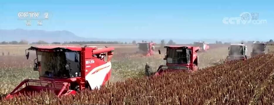 央視網(wǎng)消息:金秋時節(jié),甘肅省張掖市民樂縣的1.2萬畝高粱已經(jīng)成熟了,紅色的高粱和穿梭的聯(lián)合收割機構(gòu)成一幅色彩艷麗的豐收畫卷。