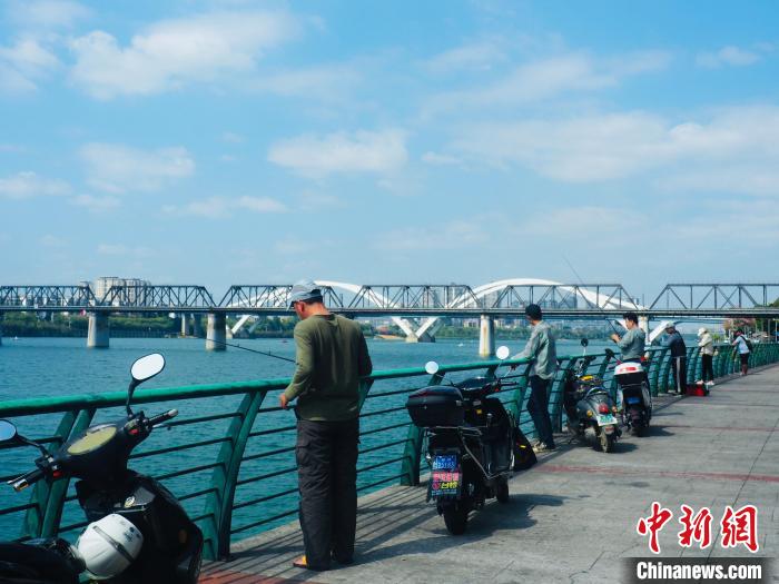 入秋,碧水藍(lán)天相互映襯,廣西柳州市的市民在柳江河的河岸上釣魚(yú)休閑?!±顙申?yáng) 攝