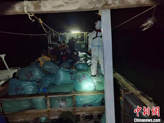案發(fā)當(dāng)晚22時許,防城港海警局東興第一工作站執(zhí)法員在海域巡邏時,發(fā)現(xiàn)一艘裝有大量袋裝貨物的漁船,形跡可疑。執(zhí)法員隨即向可疑船鳴笛、喊話亮明身份,要求其立即停船接受檢查,執(zhí)法員穿戴好防護(hù)裝具后,登臨對船上人員進(jìn)行控制。