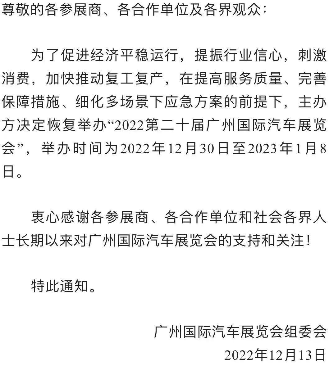 中新網(wǎng)12月13日電 據(jù)“廣州國際汽車展”公眾號消息,廣州國際汽車展覽會組委會12月13日發(fā)布通知,為了促進經(jīng)濟平穩(wěn)運行,提振行業(yè)信心,刺激消費,加快推動復工復產(chǎn),在提高服務質(zhì)量、完善保障措施、細化多場景下應急方案的前提下,主辦方?jīng)Q定恢復舉辦“2022第二十屆廣州國際汽車展覽會”,舉辦時間為2022年12月30日至2023年1月8日。(中新財經(jīng))