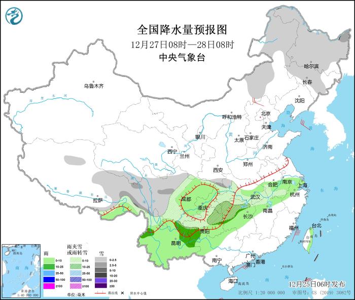 12月27日08時至28日08時,內(nèi)蒙古東部、東北地區(qū)大部、西藏北部和東部、貴州中北部、湖南西北部、湖北西部和南部等地部分地區(qū)有小到中雪或雨夾雪,其中,西藏東南部等地部分地區(qū)有大雪。西藏東南部、江淮東部和西部、江南北部、西南地區(qū)南部、廣西西北部、臺灣島等地部分地區(qū)有小雨,其中,湖南中西部、貴州西南部、云南東部和西南部、廣西西北部等地部分地區(qū)有中雨。河北北部部分地區(qū)有4~5級風(fēng)。臺灣海峽、巴士海峽、南海大部海域、北部灣將有6~7級、陣風(fēng)8級的東北風(fēng)。