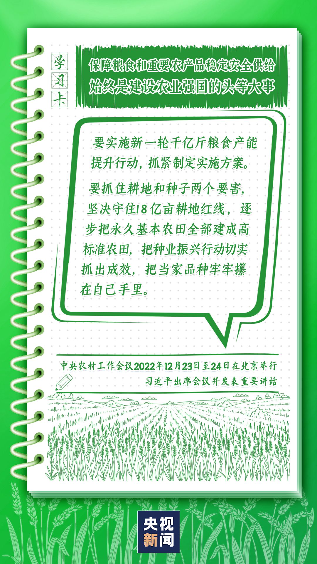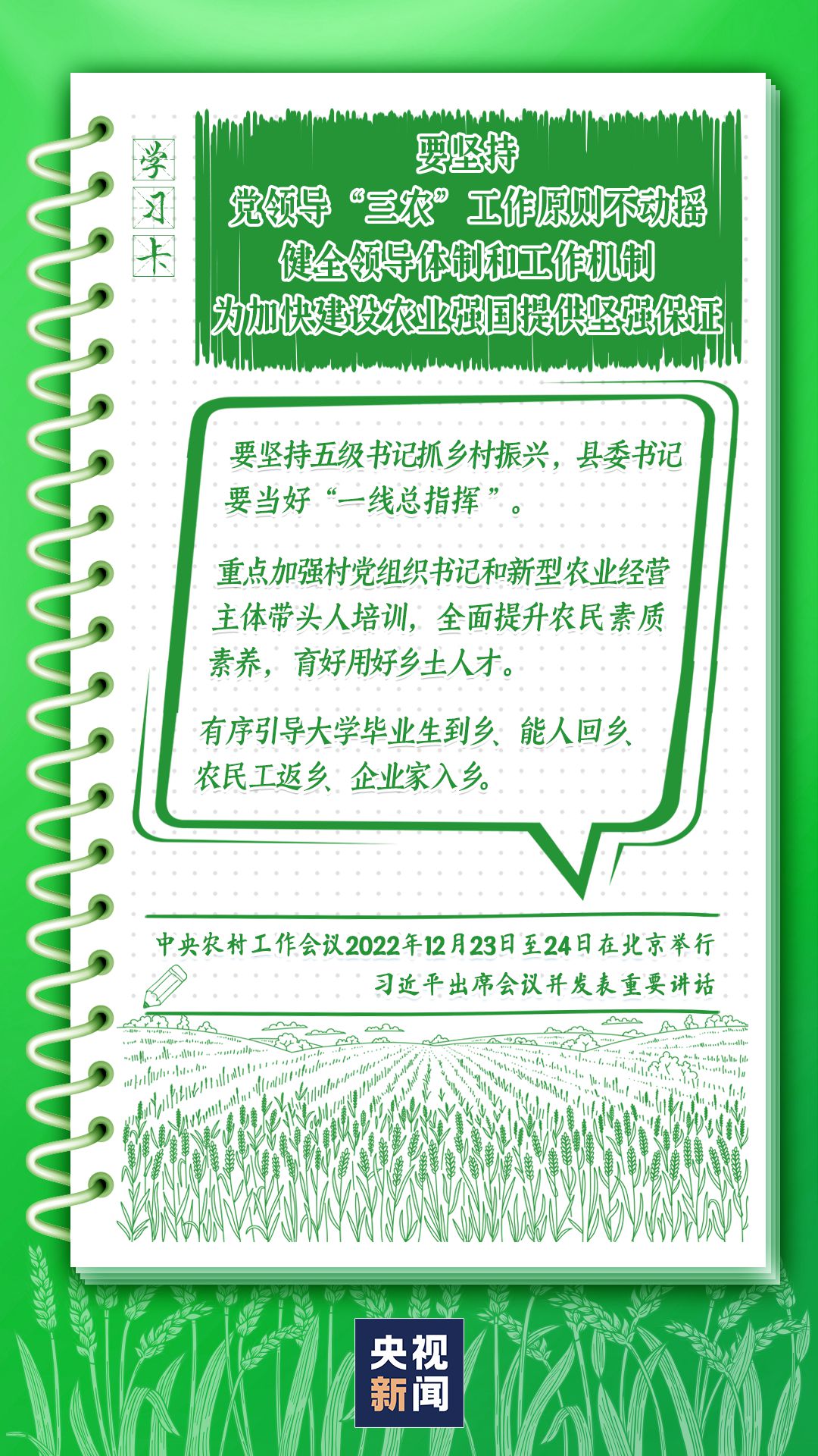 中央農(nóng)村工作會(huì)議12月23日至24日在北京舉行。習(xí)近平總書記出席會(huì)議并發(fā)表重要講話強(qiáng)調(diào),錨定建設(shè)農(nóng)業(yè)強(qiáng)國(guó)目標(biāo),切實(shí)抓好農(nóng)業(yè)農(nóng)村工作。如何建設(shè)農(nóng)業(yè)強(qiáng)國(guó)?總書記給出了“路線圖”,一起學(xué)習(xí)↓