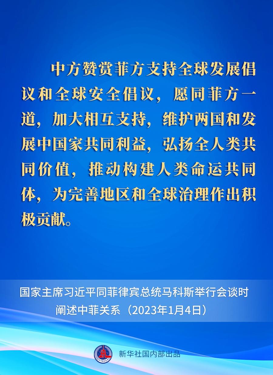 1月4日下午,國家主席習近平在人民大會堂同來華進行國事訪問的菲律賓總統(tǒng)馬科斯舉行會談。關于中菲關系,習近平主席在會談中作出一系列重要闡述。一起來看要點。