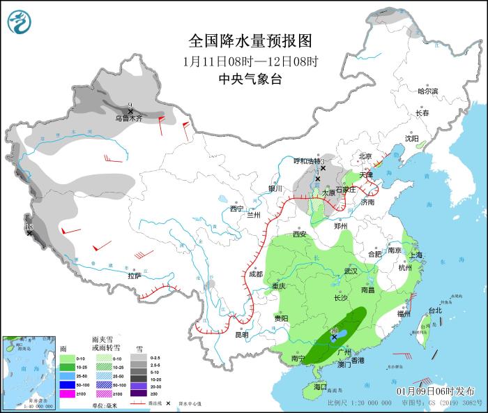1月9日08時(shí)至10日08時(shí),新疆北部和西部山區(qū)、西藏西部等地部分地區(qū)有小到中雪,其中,新疆北疆北部、西藏西部局地有大到暴雪(10~18毫米)。江南中南部、華南大部、臺(tái)灣島等地部分地區(qū)有小到中雨,其中,廣東東北部和西南部沿海、海南島北部等地局地有大雨(25~45毫米)。西藏中西部等地部分地區(qū)有5~7級(jí)風(fēng)(見(jiàn)圖1)。
