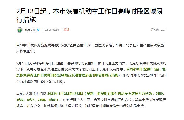 2月13日為中小學開學日,通勤、通學出行需求疊加,預計交通壓力增大。為更好保障市民群眾出行需求,統(tǒng)籌考慮北京全市交通運行情況及大氣污染防治工作,經(jīng)北京市政府同意,自2月13日(星期一)起,北京恢復實施工作日高峰時段區(qū)域限行交通管理措施(即尾號限行措施),限行時間為7時至20時,范圍為五環(huán)路以內(nèi)道路(不含五環(huán)路)。