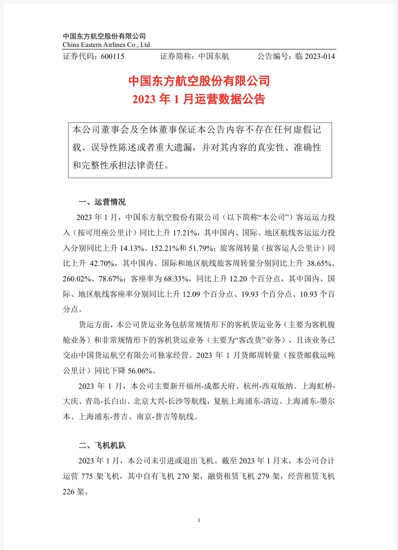 2023年1月,中國東航客運運力投入(按可用座公里計)同比上升17.21%,旅客周轉(zhuǎn)量(按客運人公里計)同比上升42.70%。