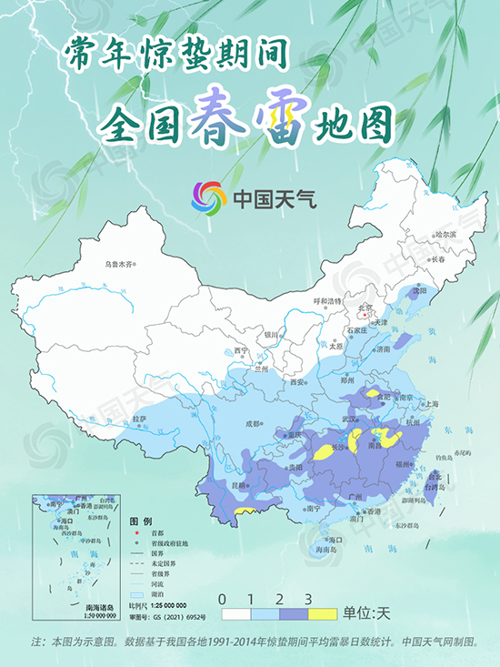 從中國(guó)天氣網(wǎng)推出的驚蟄節(jié)氣全國(guó)春雷地圖看,“驚蟄始雷”只與我國(guó)南方部分地區(qū)的氣候比較吻合。常年驚蟄期間,江南大部、云南大部、貴州南部、重慶中部、華南北部等地雷響頻繁,平均雷暴日數(shù)在2天以上,湖南、江西的部分地區(qū)可超過(guò)3天;最符合“驚蟄始雷”的是長(zhǎng)江流域,合肥、福州、廣州、南京、杭州、上海等不少地方都在此時(shí)節(jié)迎來(lái)初雷。