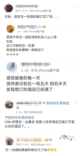 社交平臺上,多名網友早已規(guī)劃好了自己“五一”出行的計劃,并已提前購買機票和酒店,面對緊俏的旅游產品,有網友驚呼:“現(xiàn)在就已經訂不到房了嗎?”“低價機票隔一會兒就沒了!”