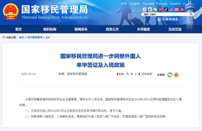 中新網(wǎng)3月14日電 據(jù)國家移民管理局網(wǎng)站消息,為更好統(tǒng)籌疫情防控和經(jīng)濟社會發(fā)展需要,便利中外人員往來,國家移民管理局決定自2023年3月15日零時起調(diào)整簽證及入境政策。