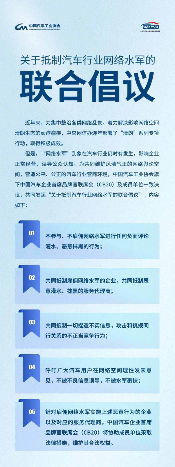 5、針對雇傭網絡水軍實施上述惡意行為的企業(yè)以及對應的服務代理商,中國汽車企業(yè)首席品牌官聯(lián)席會(CB20)將協(xié)助成員單位采取法律措施,維護其合法權益。(完)