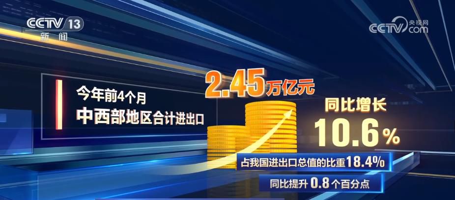 央視網(wǎng)消息:從我國外貿(mào)區(qū)域結(jié)構(gòu)來看,今年前4個月,中西部地區(qū)合計進出口2.45萬億元,同比增長10.6%,占我國進出口總值的比重18.4%,同比提升0.8個百分點。我國中西部地區(qū)進出口快速增長,增速高出全國4.8個百分點。