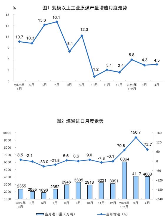 原煤、原油和天然氣生產(chǎn)及相關(guān)情況。原煤生產(chǎn)穩(wěn)步增長,進口持續(xù)大幅增加。4月份,生產(chǎn)原煤3.8億噸,同比增長4.5%,增速比3月份加快0.2個百分點,日均產(chǎn)量1272萬噸。進口煤炭4068萬噸,同比增長72.7%,增速比3月份回落78.0個百分點。
