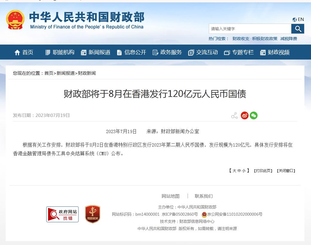 財政部將于8月在香港發(fā)行120億元人民幣國債