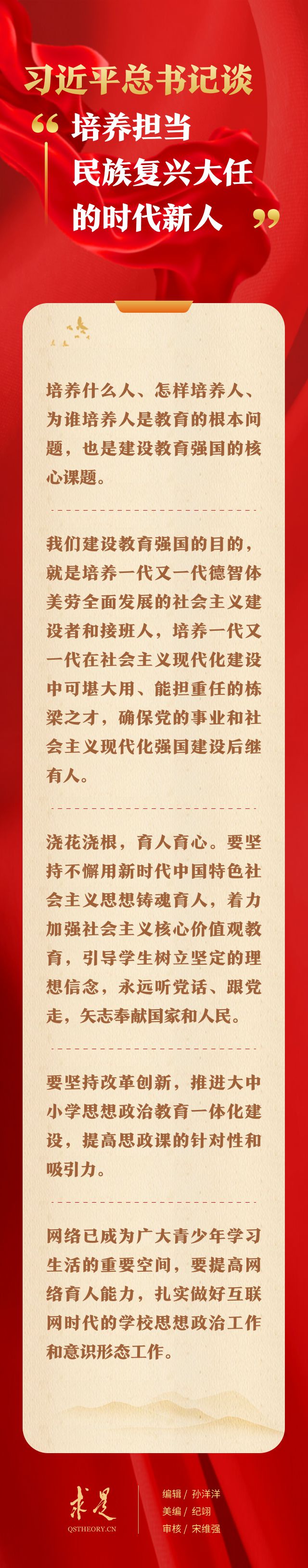 9月16日出版的第18期《求是》雜志刊發(fā)習(xí)近平總書(shū)記重要文章《扎實(shí)推動(dòng)教育強(qiáng)國(guó)建設(shè)》。在這篇重要文章中,總書(shū)記從“培養(yǎng)擔(dān)當(dāng)民族復(fù)興大任的時(shí)代新人”、“加快建設(shè)高質(zhì)量教育體系”、“全面提升教育服務(wù)高質(zhì)量發(fā)展的能力”、“在深化改革創(chuàng)新中激發(fā)教育發(fā)展活力”、“增強(qiáng)我國(guó)教育的國(guó)際影響力”、“培養(yǎng)高素質(zhì)教師隊(duì)伍”6個(gè)方面,對(duì)扎實(shí)推動(dòng)教育強(qiáng)國(guó)建設(shè)提出明確要求。