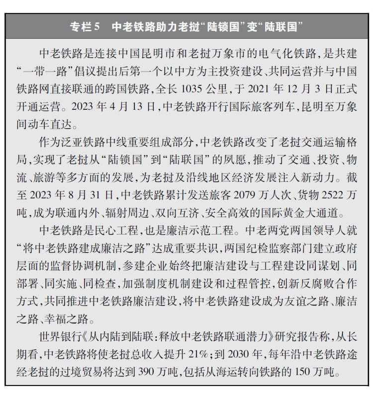 經(jīng)濟走廊和國際通道建設卓有成效。共建國家共同推進國際骨干通道建設,打造連接亞洲各次區(qū)域以及亞歐非之間的基礎設施網(wǎng)絡。中巴經(jīng)濟走廊方向,重點項目穩(wěn)步推進,白沙瓦-卡拉奇高速公路(蘇庫爾至木爾坦段)、喀喇昆侖公路二期(赫韋利揚-塔科特段)、拉合爾軌道交通橙線項目竣工通車,薩希瓦爾、卡西姆港、塔爾、胡布等電站保持安全穩(wěn)定運營,默拉直流輸電項目投入商業(yè)運營,卡洛特水電站并網(wǎng)發(fā)電,拉沙卡伊特別經(jīng)濟區(qū)進入全面建設階段。新亞歐大陸橋經(jīng)濟走廊方向,匈塞鐵路塞爾維亞貝爾格萊德-諾維薩德段于2022年3月開通運營,匈牙利布達佩斯-克萊比奧段啟動軌道鋪設工作;克羅地亞佩列沙茨跨海大橋迎來通車一周年;雙西公路全線貫通;黑山南北高速公路順利建成并投入運營。中國-中南半島經(jīng)濟走廊方向,中老鐵路全線建成通車且運營成效良好,黃金運輸通道作用日益彰顯;作為中印尼共建“一帶一路”的旗艦項目,時速350公里的雅萬高鐵開通運行;中泰鐵路一期(曼谷-呵叻)簽署線上工程合同,土建工程已開工11個標段(其中1個標段已完工)。中蒙俄經(jīng)濟走廊方向,中俄黑河公路橋、同江鐵路橋通車運營,中俄東線天然氣管道正式通氣,中蒙俄中線鐵路升級改造和發(fā)展可行性研究正式啟動。中國-中亞-西亞經(jīng)濟走廊方向,中吉烏公路運輸線路實現(xiàn)常態(tài)化運行,中國-中亞天然氣管道運行穩(wěn)定,哈薩克斯坦北哈州糧油專線與中歐班列并網(wǎng)運行。孟中印緬經(jīng)濟走廊方向,中緬原油和天然氣管道建成投產(chǎn),中緬鐵路木姐-曼德勒鐵路完成可行性研究,曼德勒-皎漂鐵路啟動可行性研究,中孟友誼大橋、多哈扎里至科克斯巴扎爾鐵路等項目建設取得積極進展。在非洲,蒙內(nèi)鐵路、亞吉鐵路等先后通車運營,成為拉動東非乃至整個非洲國家縱深發(fā)展的重要通道。