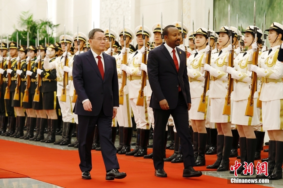 會(huì)談前,李強(qiáng)在人民大會(huì)堂北大廳為阿比舉行歡迎儀式。