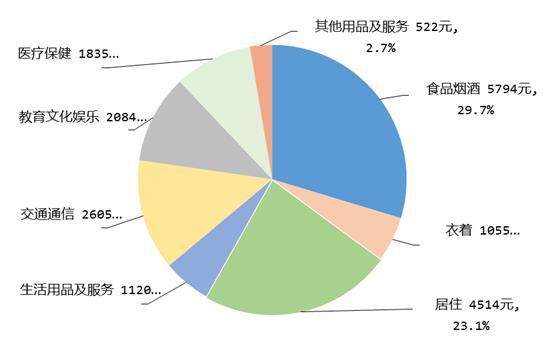 前三季度,全國(guó)居民人均食品煙酒消費(fèi)支出5794元,增長(zhǎng)6.7%,占人均消費(fèi)支出的比重為29.7%;人均衣著消費(fèi)支出1055元,增長(zhǎng)6.5%,占人均消費(fèi)支出的比重為5.4%;人均居住消費(fèi)支出4514元,增長(zhǎng)6.4%,占人均消費(fèi)支出的比重為23.1%;人均生活用品及服務(wù)消費(fèi)支出1120元,增長(zhǎng)7.4%,占人均消費(fèi)支出的比重為5.7%;人均交通通信消費(fèi)支出2605元,增長(zhǎng)11.3%,占人均消費(fèi)支出的比重為13.3%;人均教育文化娛樂(lè)消費(fèi)支出2084元,增長(zhǎng)16.4%,占人均消費(fèi)支出的比重為10.7%;人均醫(yī)療保健消費(fèi)支出1835元,增長(zhǎng)15.0%,占人均消費(fèi)支出的比重為9.4%;人均其他用品及服務(wù)消費(fèi)支出522元,增長(zhǎng)17.4%,占人均消費(fèi)支出的比重為2.7%。