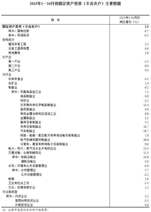 國家統(tǒng)計局:1—10月份全國固定資產投資增長2.9%