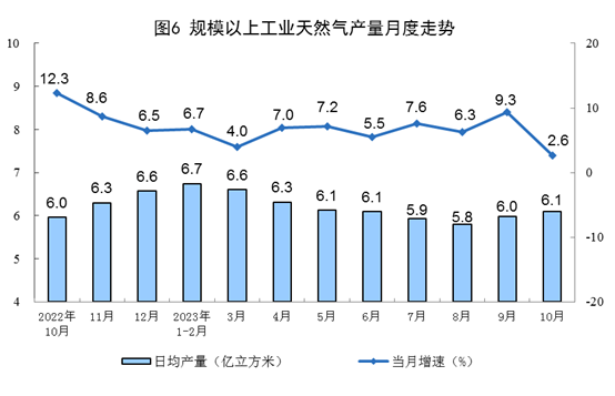 天然氣生產(chǎn)保持平穩(wěn),進口增速加快。10月份,生產(chǎn)天然氣190億立方米,同比增長2.6%,增速比9月份回落6.7個百分點,日均產(chǎn)量6.1億立方米。進口天然氣879萬噸,同比增長15.5%,增速比9月份加快15.1個百分點。