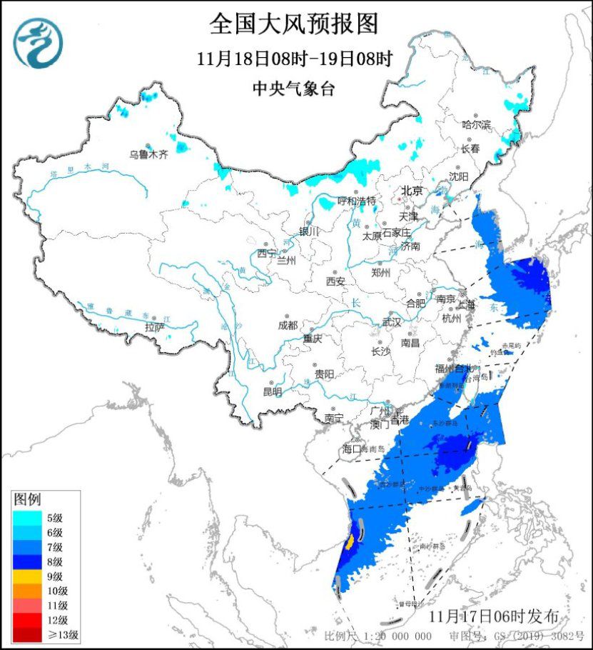 11月17日08時(shí)至18日08時(shí),內(nèi)蒙古中東部、東北大部、河北北部、山東半島東部等地將有5~6級、陣風(fēng)7~8級的大風(fēng);渤海、渤海海峽、黃海大部海域、東海大部海域、臺灣海峽、臺灣以東洋面、巴士海峽、南海大部海域?qū)⒂?~8級、陣風(fēng)9~10級的大風(fēng)。11月18日08時(shí)至19日08時(shí),內(nèi)蒙古中東部、黑龍江東部、吉林東部等地將有5~6級、陣風(fēng)7~8級的大風(fēng);黃海東部海域、東海東北部海域、臺灣海峽、臺灣以東洋面偏南海域、巴士海峽、南海大部海域?qū)⒂?~8級、陣風(fēng)9~10級的大風(fēng)。中央氣象臺11月17日06時(shí)繼續(xù)發(fā)布大風(fēng)藍(lán)色預(yù)警。