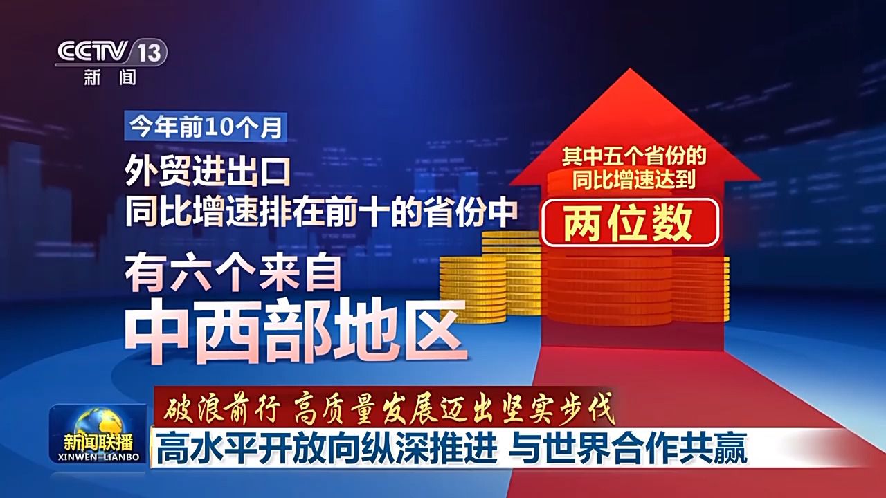 高水平開放,也讓曾經(jīng)的開放“末梢”變成“前沿”。最新數(shù)據(jù)顯示,今年前10個月,外貿(mào)進(jìn)出口同比增速排在前十的省份中,有六個來自中西部地區(qū)。其中五個省份的同比增速達(dá)到兩位數(shù)。