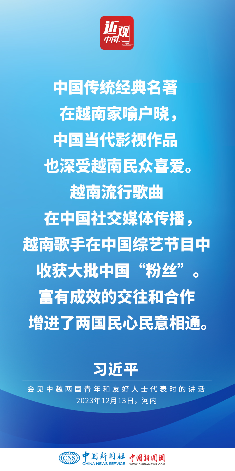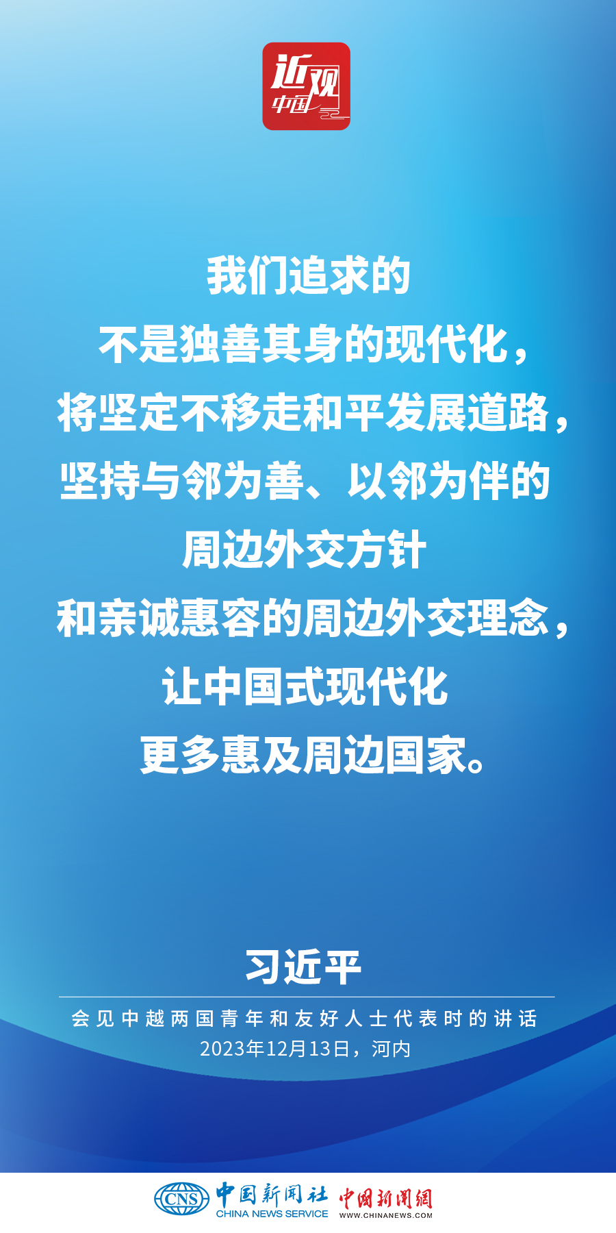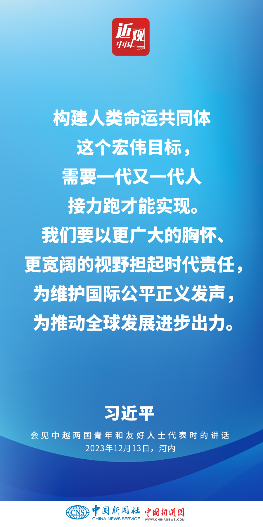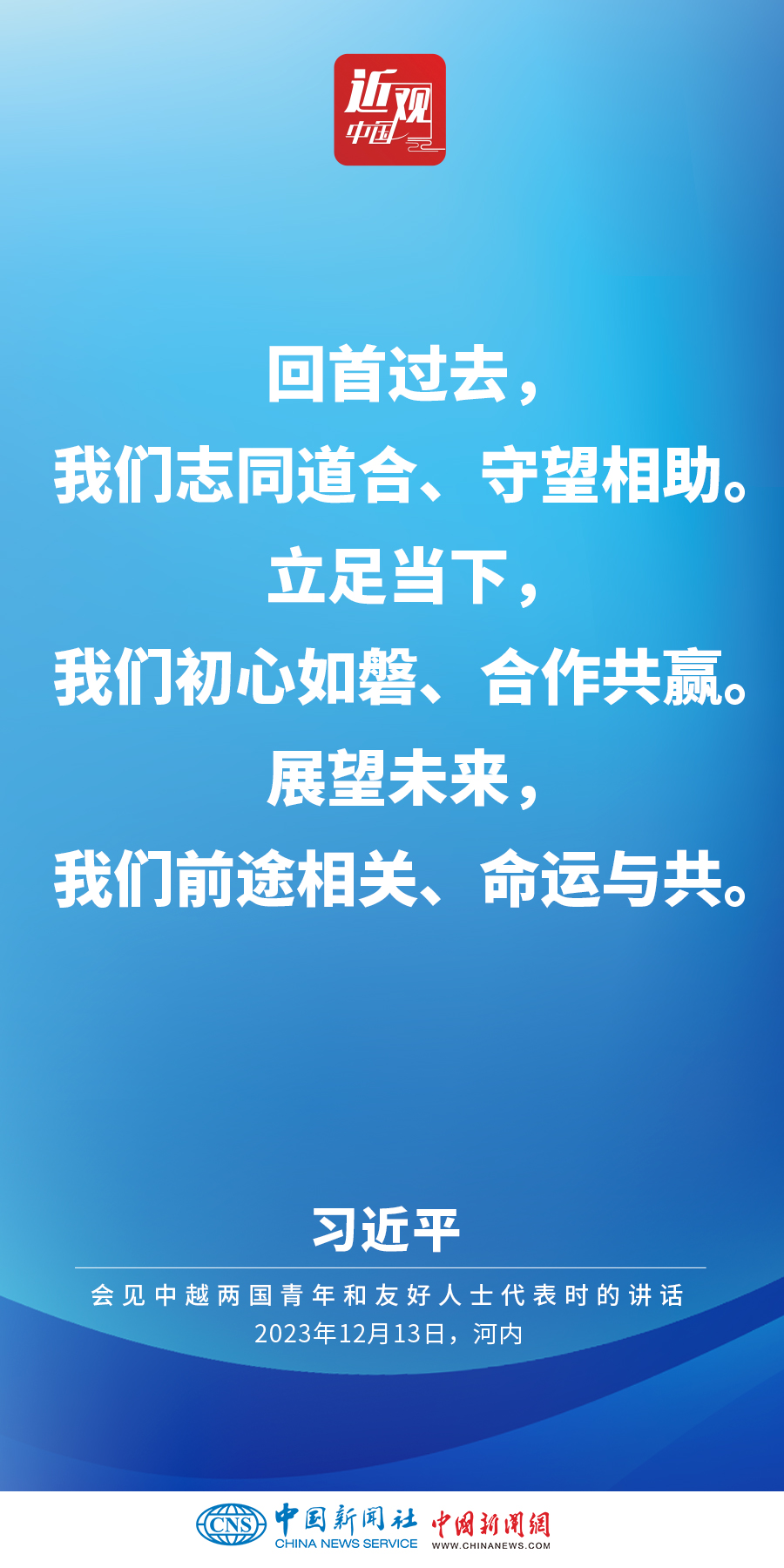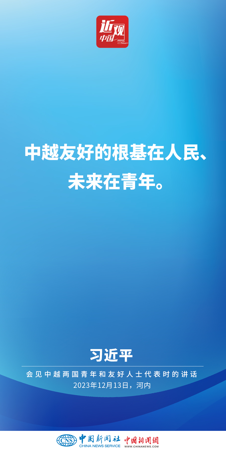 當(dāng)?shù)貢r(shí)間12月13日下午,中共中央總書記、國家主席習(xí)近平和夫人彭麗媛在河內(nèi)同越共中央總書記阮富仲夫婦共同會(huì)見中越兩國青年和友好人士代表。他在題為《賡續(xù)傳統(tǒng)友誼,開創(chuàng)中越命運(yùn)共同體建設(shè)新征程》的重要講話中指出,展望未來,我們要始終不忘初心,牢記使命,攜手走好各自社會(huì)主義道路,讓工業(yè)化現(xiàn)代化建設(shè)成果更多惠及兩國人民,共同為人類進(jìn)步事業(yè)作出更大貢獻(xiàn)。