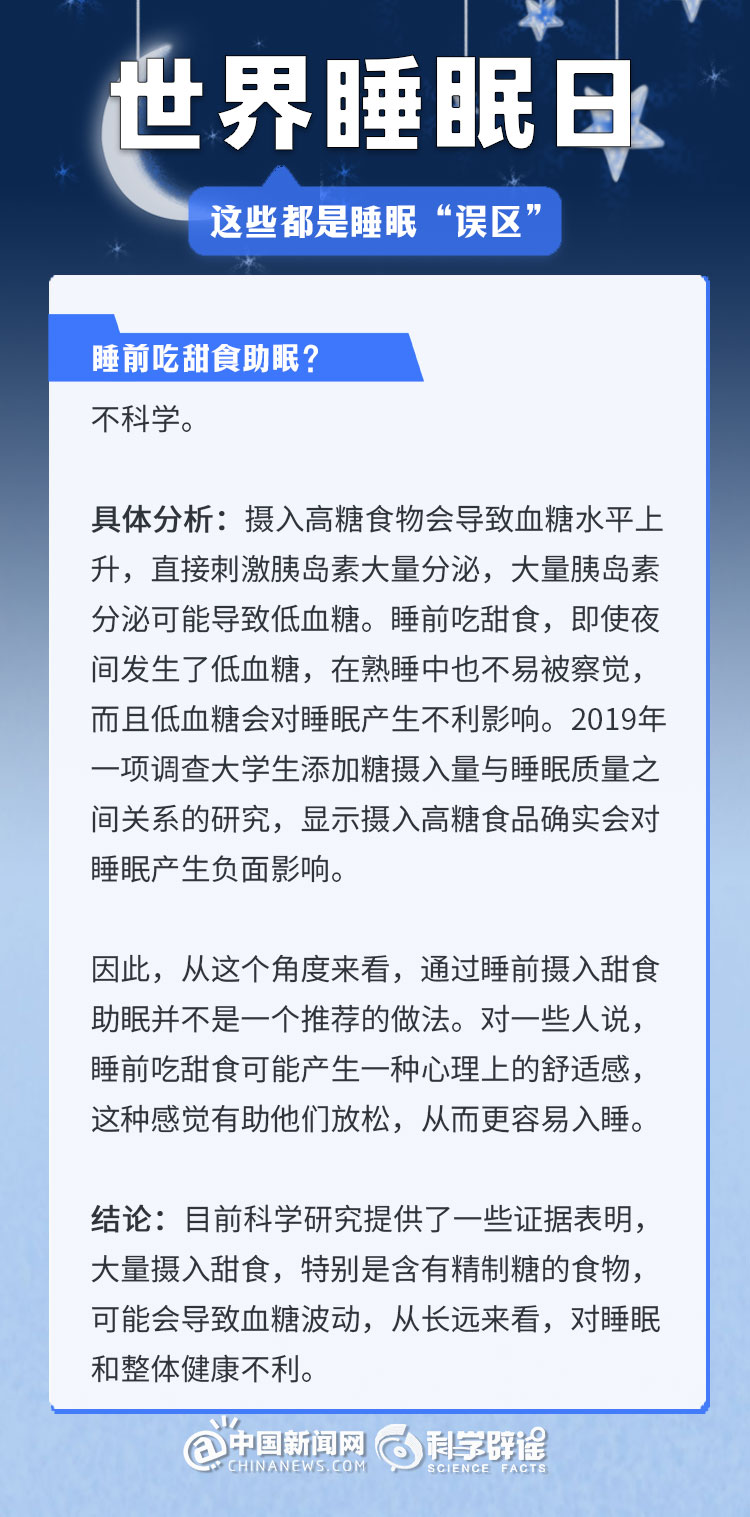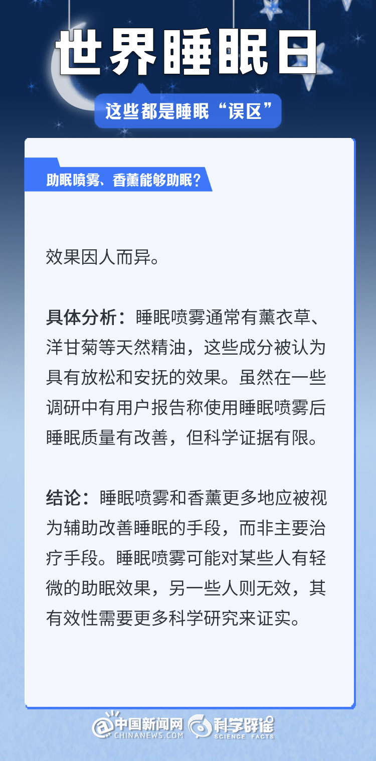 中新網3月21日電 《中國睡眠研究報告(2024)》顯示,2023年居民睡眠指數(shù)為62.61分,較2022年降低了5.16。去年的報告中,曾有近半數(shù)民眾每晚平均睡眠時長不足8小時(47.55%)。很多人正在經受著睡眠問題的困擾,為了避免大家被誤導,我們總結了幾個生活中常見的睡眠誤區(qū),一起來了解一下吧!(來源:科學辟謠 中國新聞網微博)