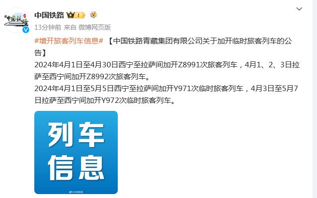 中新網(wǎng)3月22日電 據(jù)中國(guó)國(guó)家鐵路集團(tuán)有限公司官方微博消息,中國(guó)鐵路青藏集團(tuán)有限公司3月22日發(fā)布關(guān)于加開臨時(shí)旅客列車的公告:2024年4月1日至4月30日西寧至拉薩間加開Z8991次旅客列車,4月1、2、3日拉薩至西寧間加開Z8992次旅客列車。2024年4月1日至5月5日西寧至拉薩間加開Y971次臨時(shí)旅客列車,4月3日至5月7日拉薩至西寧間加開Y972次臨時(shí)旅客列車。