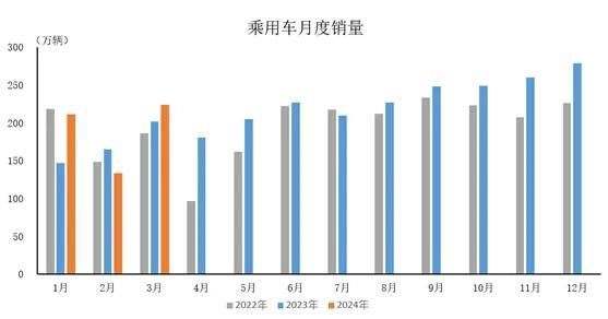 2024年3月,乘用車產(chǎn)銷分別完成225萬輛和223.6萬輛,環(huán)比分別增長(zhǎng)76.7%和67.8%,同比分別增長(zhǎng)4.7%和10.9%。