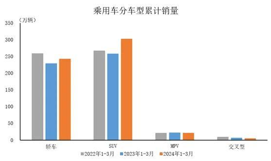 2024年1-3月,在乘用車主要品種中,與上年同期相比,運(yùn)動(dòng)型多用途乘用車(SUV)產(chǎn)銷呈兩位數(shù)增長(zhǎng),基本型乘用車(轎車)產(chǎn)銷小幅增長(zhǎng),多功能乘用車(MPV)和交叉型乘用車產(chǎn)銷呈不同程度下降。