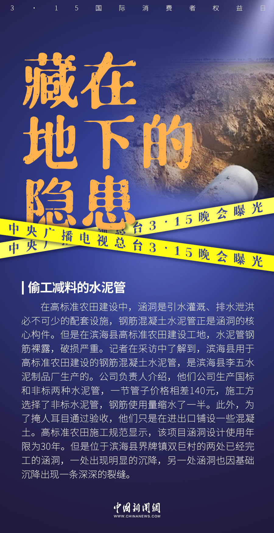 晚會曝光江蘇省鹽城市濱??h高標(biāo)準(zhǔn)農(nóng)田的地下漏洞,用于建設(shè)的鋼筋混凝土水泥管存在偷工減料問題。施工方選擇了非標(biāo)水泥管,鋼筋使用量縮水了一半。中新財(cái)經(jīng)記者從鹽城市場監(jiān)管局獲悉,工作人員已經(jīng)行動(dòng),后續(xù)信息會及時(shí)對外公布。