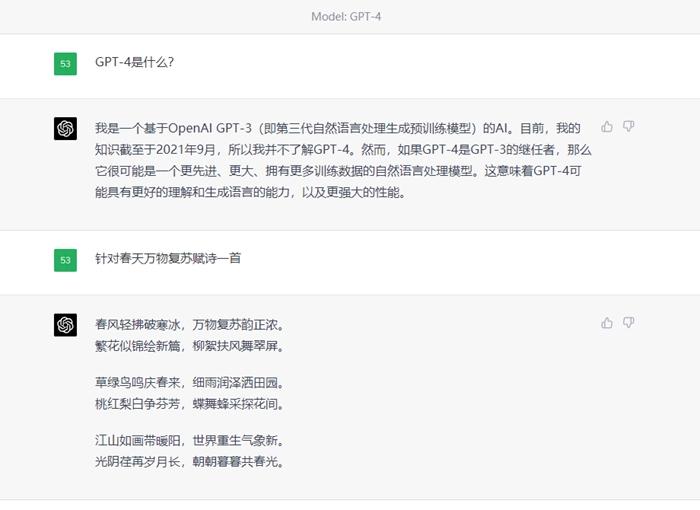 目前GPT-4僅限于ChatGPT Plus訂戶使用。記者體驗時發(fā)現(xiàn),GPT-4生成速度比較慢,但回答簡明扼要,更有創(chuàng)造性,無論是寫詩歌還是故事劇本都不在話下。例如它可以根據(jù)“春天萬物復蘇”賦詩一首或者寫成一個愛情故事的劇本。