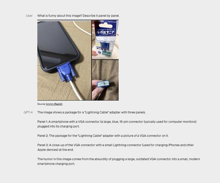 不過據(jù)OpenAI介紹,在輸入一張畫有VGA線連接手機充電接口內容的圖像后,GPT-4除了能描述出這幅圖中的內容,還能指出這張圖有哪些不對勁,“這幅圖中的幽默來自于將一個大的過時的VGA連接器插入一個小的現(xiàn)代化的智能手機充電端口。”