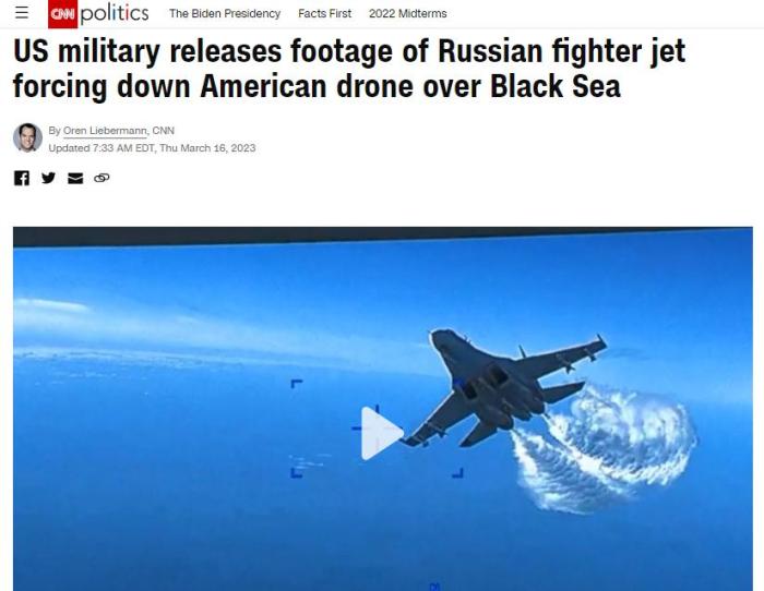 報(bào)道還稱,當(dāng)俄羅斯蘇-27戰(zhàn)斗機(jī)再次靠近時(shí),又一次“傾倒燃料”。隨后,俄羅斯蘇-27戰(zhàn)斗機(jī)與美國(guó)MQ-9“死神”無人機(jī)“相撞”,導(dǎo)致螺旋槳受損,無人機(jī)的視頻也由此中斷。不過,CNN同時(shí)指出,俄羅斯否認(rèn)發(fā)生了“碰撞”。