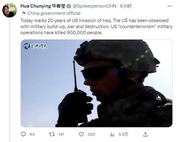 華春瑩在第一條推文中轉(zhuǎn)發(fā)了關(guān)于美國發(fā)動伊拉克戰(zhàn)爭的一個調(diào)查視頻,并配文稱,“今天是美國入侵伊拉克20周年。美國一直沉迷于軍事建設(shè)、戰(zhàn)爭和破壞。美國的‘反恐’軍事行動已造成90萬人死亡。”