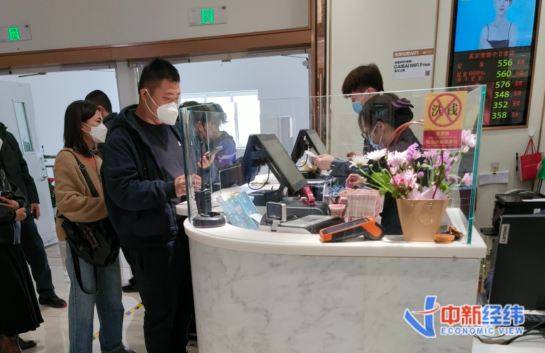 菜百黃金投資金條柜臺(tái)使用現(xiàn)金交易的顧客 來源:中新經(jīng)緯 馬靜 攝