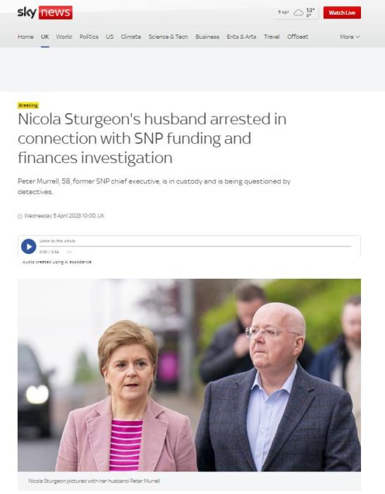 中新網4月5日電 據(jù)英國廣播公司(BBC)報道,英國蘇格蘭政府前首席大臣妮古拉·斯特金的丈夫因與蘇格蘭民族黨財政調查有關而被捕。