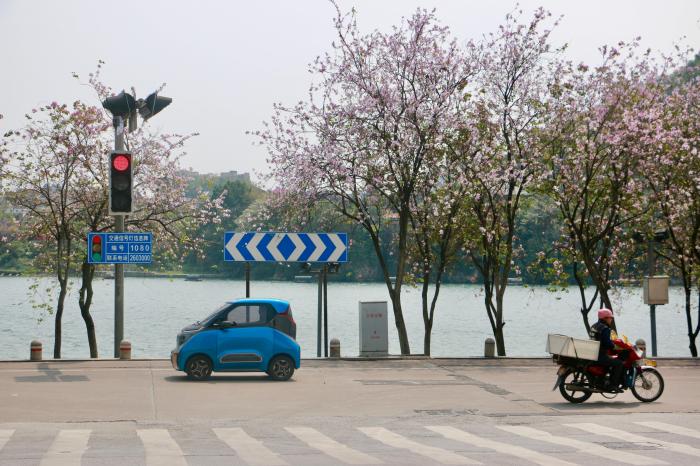 在社交平臺(tái)上看到柳州滿城洋紫荊盛開景色的馮禎雨,專程從湖南長(zhǎng)沙市坐動(dòng)車到柳州賞花。她表示:“乘坐當(dāng)?shù)赝瞥龅馁p花專線公交車,領(lǐng)略花開滿城的美景,感受春天的美好和生機(jī),十分愉悅?!?/p>