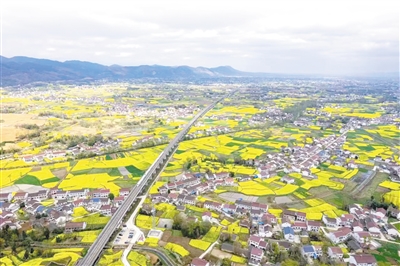 陜西省漢中市南鄭區(qū)岳家?guī)X村,一列動車組列車在金燦燦的油菜花海中穿行。