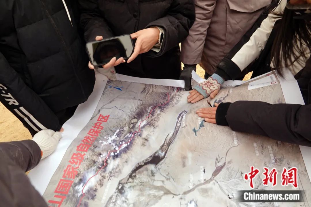 2023年4月,第三次新疆科考阿爾金山野外科考隊一行,前往阿爾金山國家級自然保護區(qū)庫木庫里沙漠的沙子泉考察調研,遭遇強沙塵暴天氣,科考隊員查看地圖。孫自法 攝