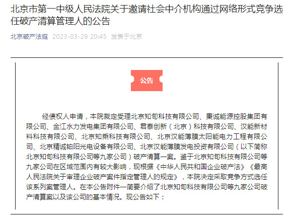 經(jīng)債權(quán)人申請(qǐng),北京市第一中級(jí)人民法院裁定受理北京知旬科技有限公司、秉誠能源控股集團(tuán)有限公司、金江水力發(fā)電集團(tuán)有限公司、君泰創(chuàng)新(北京)科技有限公司、漢能新材料科技有限公司、北京知乘科技有限公司、北京漢能薄膜太陽能電力工程有限公司、北京精誠鉑陽光電設(shè)備有限公司、北京漢能薄膜發(fā)電投資有限公司破產(chǎn)清算一案。