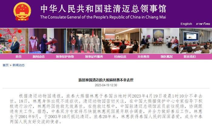 中新網(wǎng)4月19日電 綜合報道,據(jù)中國駐清邁總領事館消息,泰國清邁動物園通報,旅泰大熊貓“林惠”于當?shù)貢r間2023年4月19日凌晨1時10分不幸去世。