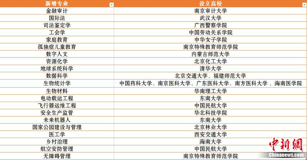 記者梳理發(fā)現(xiàn),21種新專業(yè)涉及10大類,包括金融審計、國際法、司法鑒定學、工會學、家庭教育、孤獨癥兒童教育、數(shù)字人文、資源化學、地球系統(tǒng)科學、數(shù)據(jù)科學、生物統(tǒng)計學、生物材料、電動載運工程、飛行器運維工程、安全生產(chǎn)監(jiān)管、未來機器人、國家公園建設與管理、醫(yī)工學、鄉(xiāng)村治理、航空安防管理、無障礙管理。