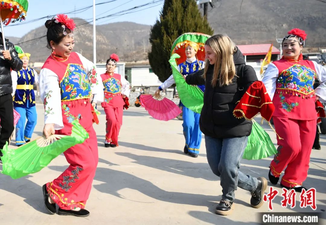 2023年2月,中國傳統(tǒng)節(jié)日元宵節(jié),河北省石家莊市井陘縣小作鎮(zhèn)桃林坪村,俄羅斯留學(xué)生曉燕(右二)體驗(yàn)非遺“井陘拉花”。翟羽佳 攝
