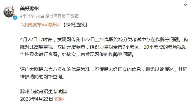 中新網(wǎng)4月23日電 據(jù)安徽省滁州市委宣傳部官方微博消息,滁州市教育招生考試院23日發(fā)布情況通報(bào)。通報(bào)稱,4月22日17時(shí)許,發(fā)現(xiàn)網(wǎng)傳滁州市22日上午高職院校分類考試中存在作弊等問題。