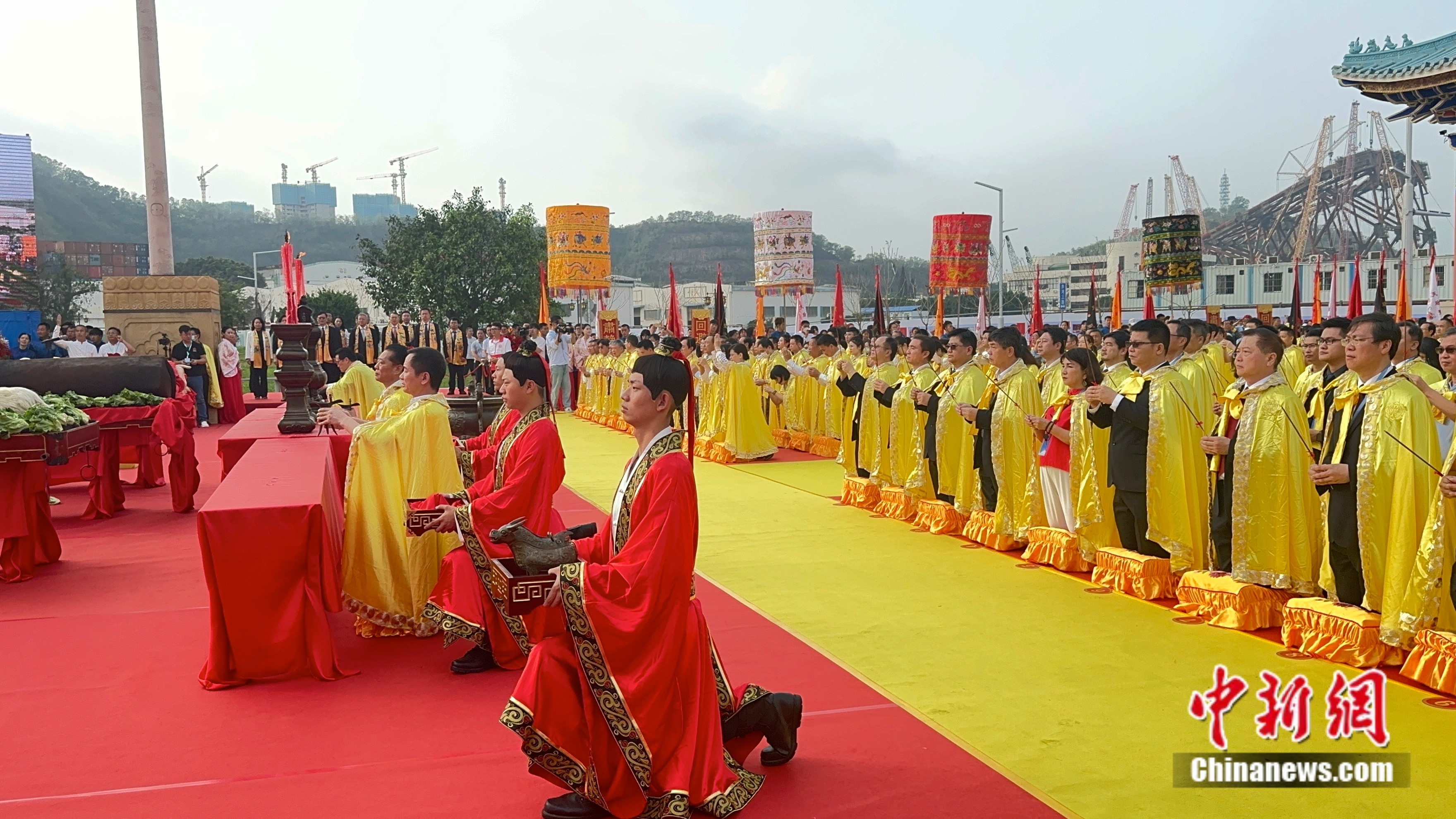 上午7點(diǎn)30分,正祭儀式正式開始。深圳南山天后博物館遵循古制,恢復(fù)古禮,結(jié)合嶺南傳統(tǒng)文化,再現(xiàn)明代“辭沙”祭祀的場景。大典現(xiàn)場,祭祀嘉賓和承獻(xiàn)官等在主持人的引導(dǎo)下,將祭祀流程一一完整演繹。