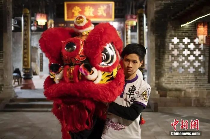 圖為2022年1月18日晚,廣州市天河區(qū)車陂龍獅體育會舞獅隊(duì)隊(duì)員王智銘在晴川蘇公祠拿著一頭紅獅。王智銘是一名“00后”,學(xué)習(xí)舞獅已3年,他說自己的目標(biāo)是“世界獅王”。 中新社記者 陳楚紅 攝